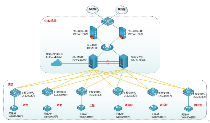 为方便用户对无线管理和维护,提升用户无线体验,使无线更智能化,此次采用365英国上市公司智能云管理平台ImCloud 8260实现无线统一的管理、维护、认证,并可实现对全网无线设备管理、实现易部署、易维护、易扩展的无线网络。365英国上市公司云管理ImCloud方案是网络服务的新模式,基于云端实现网络服务和管理,将复杂的网络管理简单化、智能化、可视化,提升用户网络体验。同时为了保证无线的安全,无线采用Portal准入认证,云管理ImCloud和365英国上市公司身份认证系统DCSM-BR实现联动,用户需要顺利获得账号和密码认证成功后才能接入无线网络,在保证无线连接的便捷性同时兼顾无线的安全性。